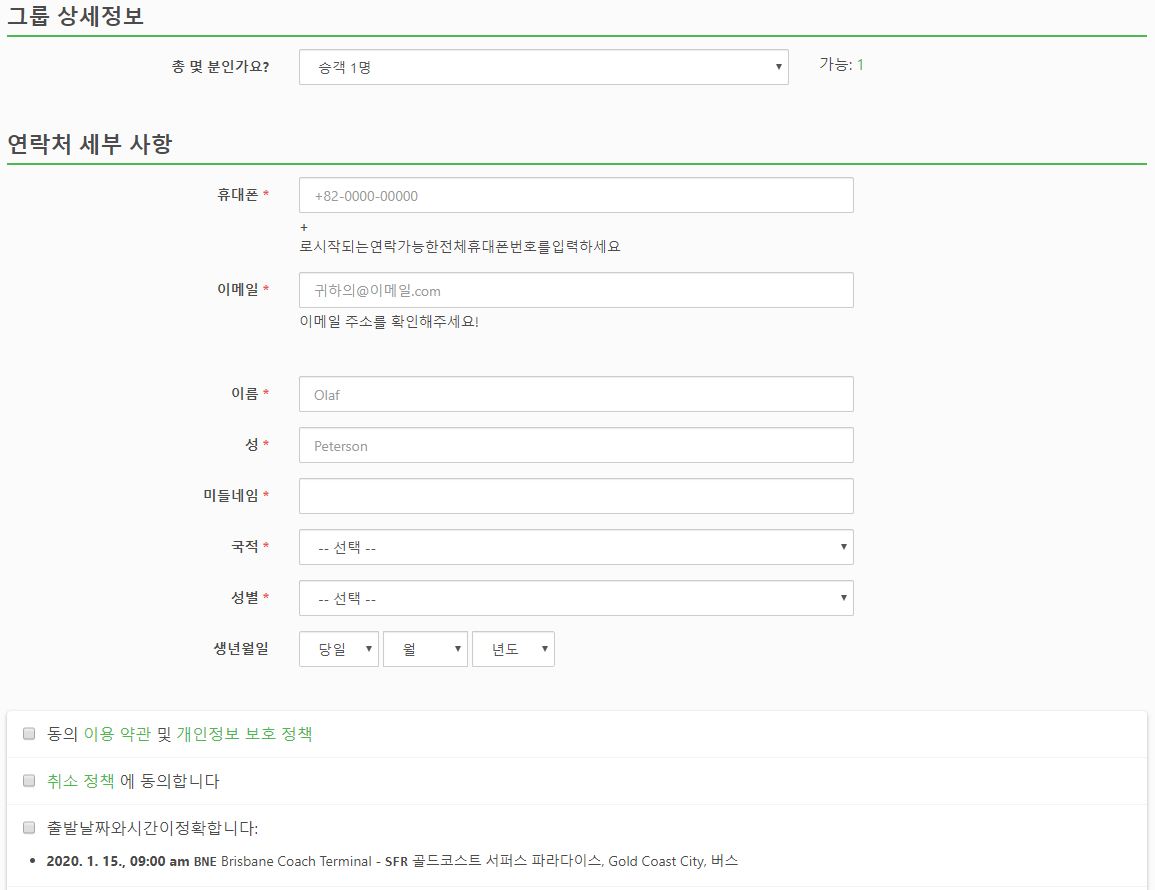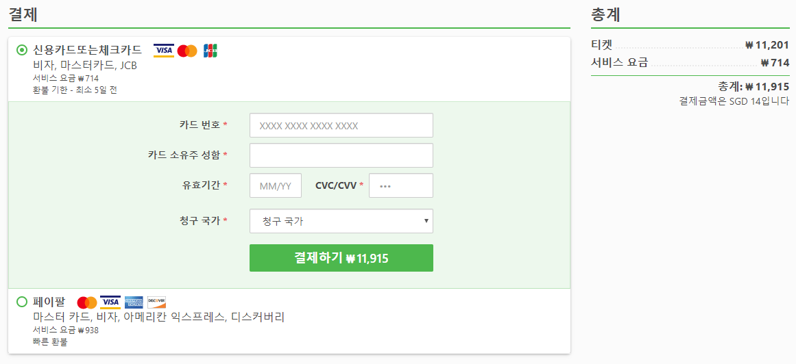 예약시에는 인원인원, 모바일번호, 이메일, 이름, 성을 입력하고 국적, 성별, 생년월일을 입력하고 결제는 신용카드 또는 페이팔로 결제가 가능하며, 신용카드의 경우 티켓요금이 11,201원이면 결제수수료 714원이 추가로 결제됩니다.
