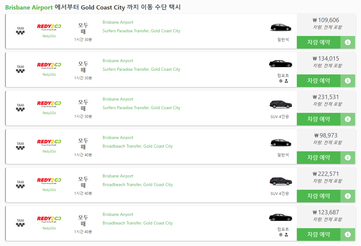 버스외에도 브리즈번 공항에서 골드코스트 서퍼스 파라다이스로 이동할 수 있는 택시 교통편도 있으며,