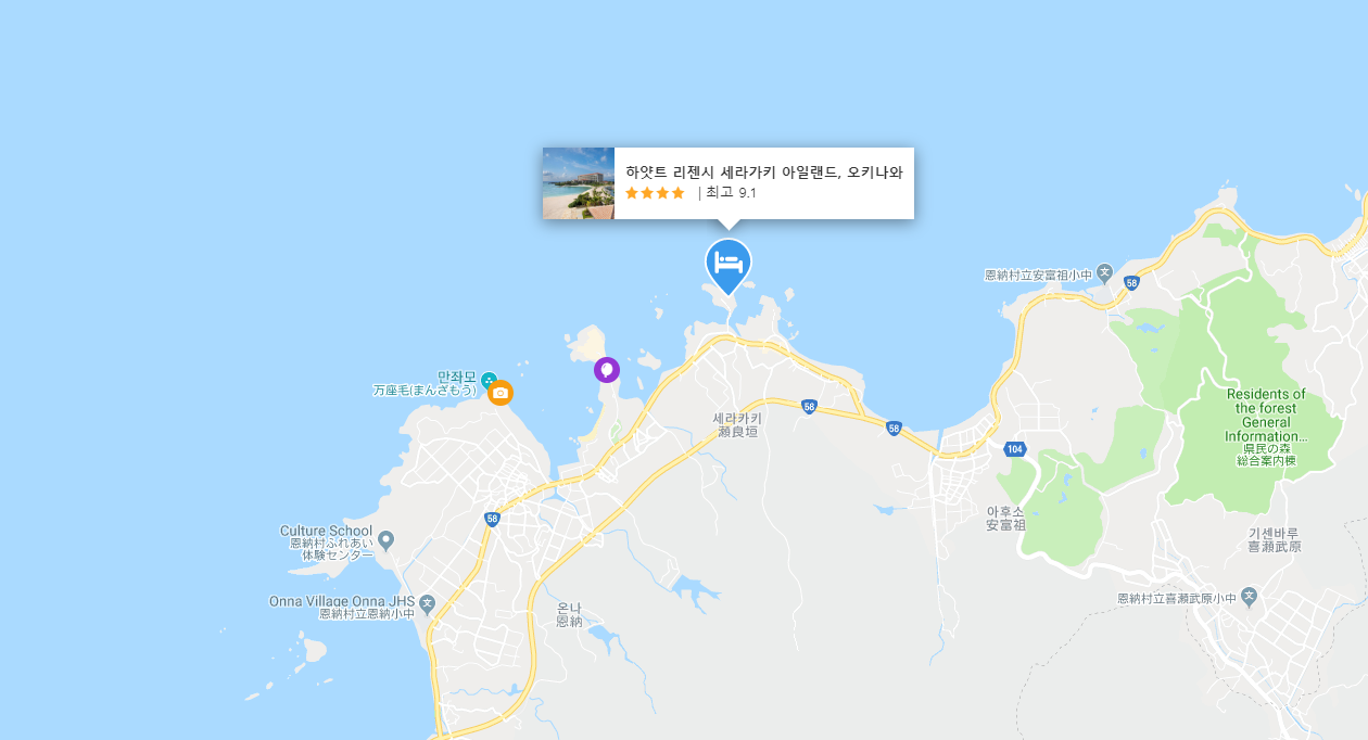 하얏트 리젠시 세라가키 아일랜드, 오키나와 (Hyatt Regency Seragaki Island, Okinawa)는 모든 객실에 전용 욕조가 있고, 오션뷰를 자랑하며 나하공항에서는 50km, 마에다 곶 16km, 만좌모에서는 3.2km 떨어져 있습니다. 2018년에 지어져 시설들도 무척 깨끄샇고 쾌적하게 지내기 좋은 온나지역의 인기리조트입니다.