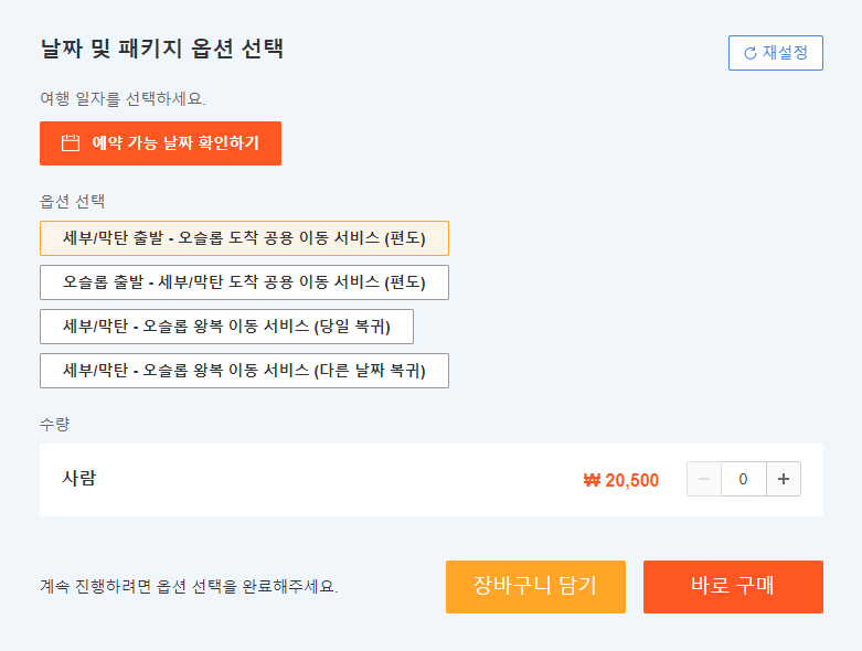 주의사항: 다른 날짜에 복귀하는 일정으로 왕복 서비스를 이용하시려면, 다른 날짜에 복귀하는 패키지를 예약하세요.