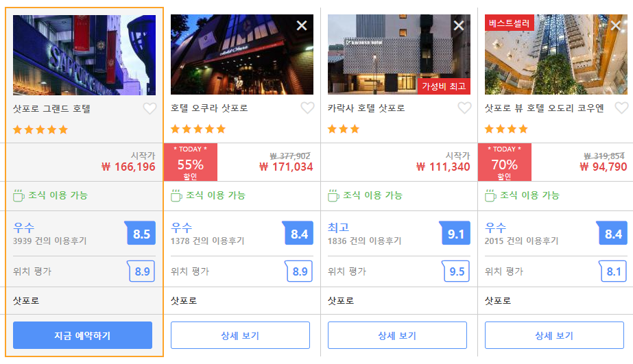 삿포로 그랜드 호텔 (Sapporo Grand Hotel)의 최저 가격대는 아고다에서 할인특가 가격으로 매일매일 변동되며 10만원대부터 다양하게 형성됩니다. 아고다 최저가를 확인하시려면 아래 링크를 누르시면 원하는 날짜의 가격대를 자세히 보실 수 있습니다.