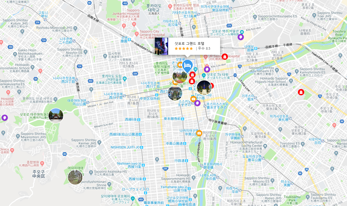 홋카이도 삿포로여행의 추천하는 삿포로 그랜드 호텔 (Sapporo Grand Hotel)은 삿포로역에서 걸어서 한 5분정고의 거리로 오도리공원도 가깝고, 주볍에 편이점이나, 카페, 쇼핑몰 등이 많아 편하게 여행하기 좋은 위치의 삿포로호텔입니다. 호텔은 삿포로역과 스스키노역 중간에 위치해 있다고 보시면 되며, 호텔 바로 앞에 공항버스 정류장도 있고, 오도리 공원 테레비 타워 앞에서 노보리벳츠 료칸 셔틀도 운행하고 있습니다.