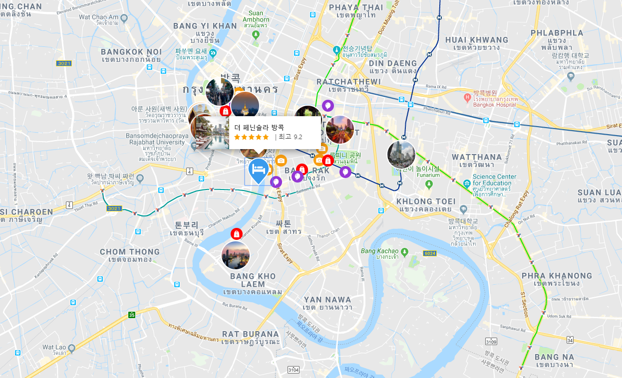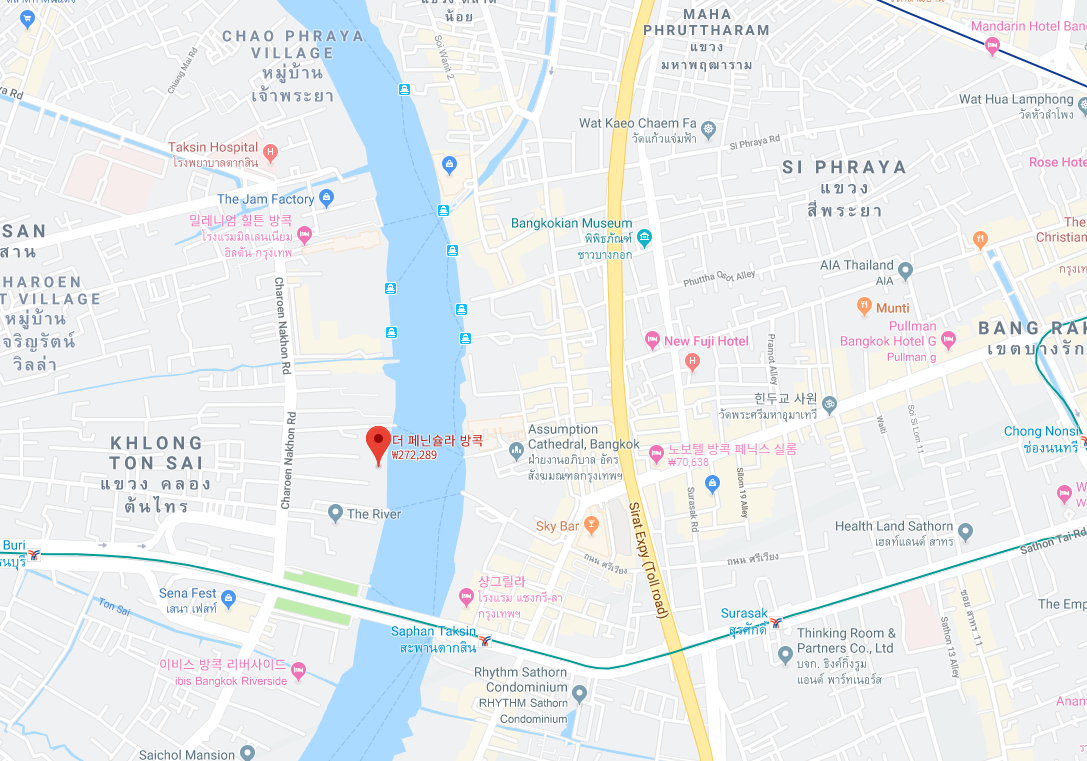 더 페닌슐라 방콕 (The Peninsula Bangkok)호텔은 한국어가 가능한 외국스텝이 있었으며,고풍스러운 느낌, 강변에 위치하여 휴양느낌의 분위기로 편안하게 휴식을 취하기 좋으며,걸어서 나가는 쪽은 로컬느낌 물씬, 페리가 있는 쪽은 관광지 느낌이 물씬납니다.걸어서 현지 쇼핑몰과 시장등이 있으며, 탑스마트까지는 툭툭이 타고 많이 주시면 100바트정도 듭니다.