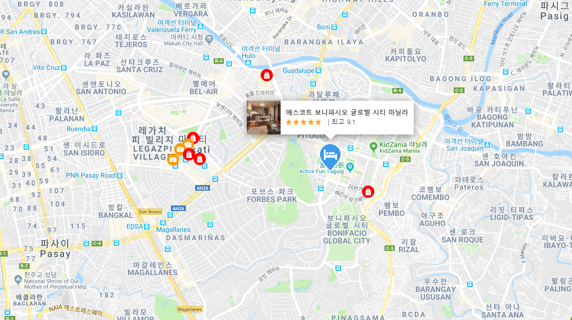 마닐라 호텔 애스코트 보니파시오 글로벌 시티 마닐라 (Ascott Bonifacio Global City Manila)는 마카티지구와 매우 가까우며, 마닐라 아키노 공항(Ninoy Aquino International)과는 7.4km 떨어져 있고,마인드 박물관(Mind Museum), St. Lukes Medical Centre와, S&R Membership Shopping 가 주변에 있어 편리한 위치의 마닐라호텔입니다.