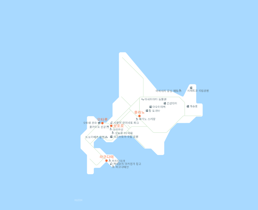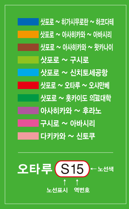 삿포로를 기준으로 서쪽에 조잔케이온천, 아사리가와온천, 곤부온천, 도야호온천, 유노카와온천 도시로이동하실 수 있으며, 북쪽으로 왓카나이까지, 남쪽으로는 도마코마이, 노보리베쓰 도시도 갈수있고,동쪽으로 우토로온천, 온네유온천, 아칸호온천이 있는 도시로 이동이 편리한 JR 홋카이도 노선입니다.
