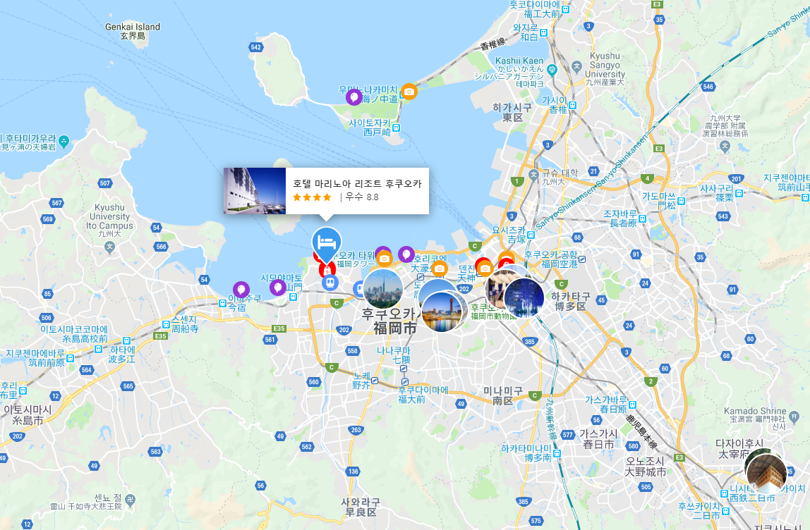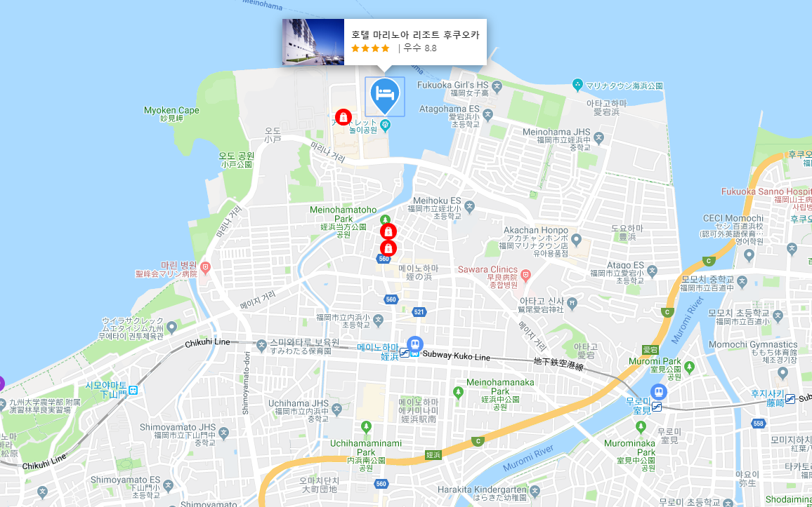마리노아 리조트 1박 후기입니다. 일단 아고다 리뷰만으로 최종 선택하여 예약했습니다. 후쿠오카 공항에서 전철로 12정거장, 내려서 쇼와 버스로 4(?)정거장 들어가면 나오는 위치였습니다. (텐진 등등 시내에서 타면 6~8정거장 정도) 서울이나 부산등 전철 생활권의 사람들이라면 크게 멀다고 생각되어지는 거리는 아닙니다.