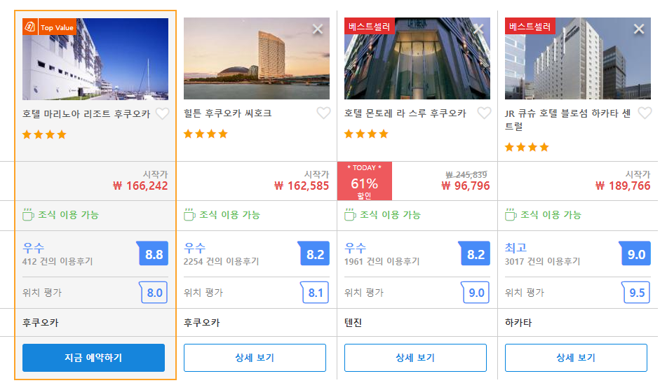호텔 마리노아 리조트 후쿠오카 (Hotel Marinoa Resort Fukuoka)의 최저 가격대는 아고다에서 할인특가 가격으로 매일매일 변동되며 20만원대부터 다양하게 형성됩니다. 아고다 최저가를 확인하시려면 아래 링크를 누르시면 원하는 날짜의 가격대를 자세히 보실 수 있습니다.