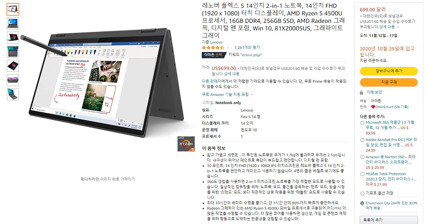 2 IN 1 노트북 직구 // 14인치 노트북형 태블릿의 AMD Ryzen 5 4500U 프로세서 Lenovo Flex 5 2-in-1 노트북 699달러